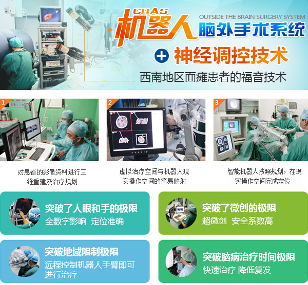 三维立体定向神经修复术采用先进的三维立体定向神经修复技术。通过先进的三位立体定向技术准确找到病灶、受损的面神经部位,在三维体力定向将活性的神经因子直接输入到受损的病灶部位,这个神经因子可以分化为神经修复因为以及神经生长因子,利用神经修复因子修复受损的面神经,利用神经生长因子促进神经细胞的分裂再生。从而达到修复面神经的目的。