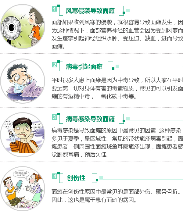 面瘫:俗称“面神经炎”、“歪嘴巴”、“吊线风”是由各种原因引起的面部表情肌群运动功能障碍的主要特征的一种常见病。主要表现为嘴眼歪斜、面部抽搐、表情怪异、口角流涎、不自主流泪等。患者连较基本的抬眉、闭眼、鼓腮等动作都无法完成。引起面瘫的主要病因有以下几种: